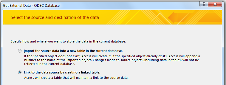 The dialog box appears to import or link to the ODBC database. In our case, we'd like to link to the database so we always have the latest data: