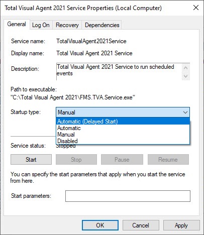 Locate the service named “Total Visual Agent 2021 Service", right-click and select "Properties", or double click on the service to open the Properties window.